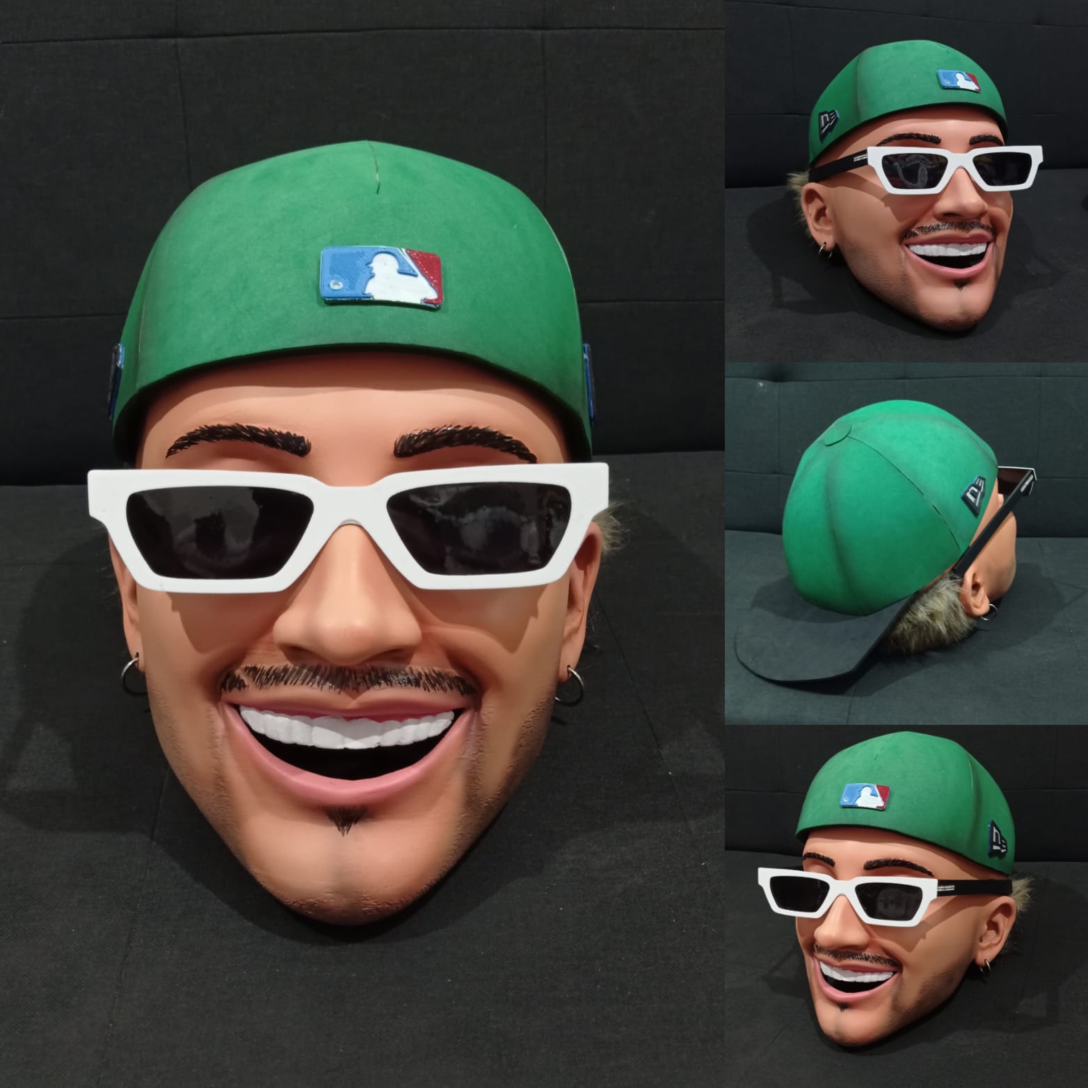 Fabricado en resina poliester de alta resistencia, cada detalle del rostro (sonrisa contagiosa, bigote y perilla, gafas blancas y gorra verde con visera plana) está cuidadosamente pintado a mano con acabado mate para un realismo sorprendente. En su interior encontrarás un acolchado de espuma EVA, que garantiza un ajuste cómodo y firme en cualquier tamaño de cabeza.